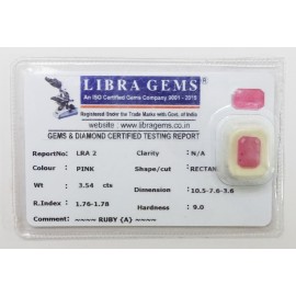REPORT NO . LRA 2CLARITY . N/ACOLOUR . PINKSHAPE / CUT . RECTANGLEWT . 3.54 CTSDIMENSION . 10-5.7-6.3-6.R . INDEX . 1.76-1.78HARDNESS . 9.0COMMENT . RUBY { A }..
