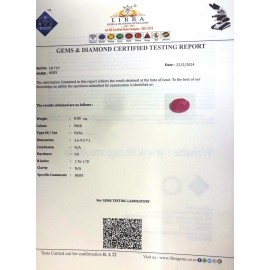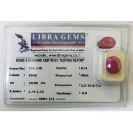 REPORT.NO.-LRA 138CLARITY.-N/ACOLOUR.-PINKSHAPE/CUT.-OVALWT.-10.88 CTSDIMENSION.-2-3.10-6.7-5.R.INDEX.-1.76-1.78HARDNESS.-9.0COMMENT.-RUBY { A }..