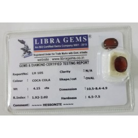 REPORT NO . LH 105CLARITY . N/ACOLOUR . COCA COLASHAPE / CUT . OVALWT . 4.15 CTSDIMENSION . 10-5.8-4.4-9.R . INDEX . 1.92-2.02HARDNESS . 6.5-7.5COMMENT . HESSONITE..