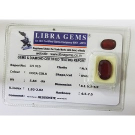 REPORT.NO.-LH 315CLARITY.-N/ACOLOUR.-COCA COLASHAPE/CUT.-OVALWT.-5.84 CTSDIMENSION.-4-1.9-3.4-9.R.INDEX.-1.92-2.02HARDNESS.-6.5-7.5COMMENT.-HESSONITE..