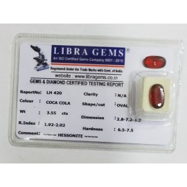 REPORT.NO.-LH 420CLARITY.-N/ACOLOUR.-COCA COLASHAPE/CUT.-OVALWT.-3.55 CTSDIMENSION.-2-8.7-2.3-9.R.INDEX.-1.92-2.02HARDNESS.-6.5-7.5COMMENT.-HESSONITE..