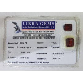 REPORT NO . LHS 78CLARITY . N/ACOLOUR . COCA COLASHAPE / CUT . SQUAREWT . 5.68 CTSDIMENSION . 9-7.9-6.6-3.R . INDEX . 1.92-2.02HARDNESS . 6.5-7.5COMMENT . HESSONITE { S }..