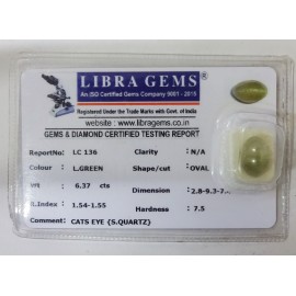 REPORT NO . LC 136CLARITY . N/ACOLOUR . L . GREENSHAPE / CUT . OVALWT . 6.37 CTSDIMENSION . 2-8.9-3.7-4.R . INDEX . 1.54-1.55HARDNESS . 7.5COMMENT . CATS EYE { S . QUARTZ }..