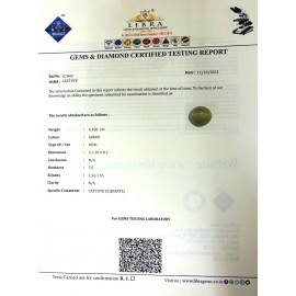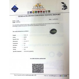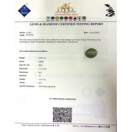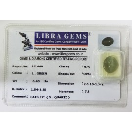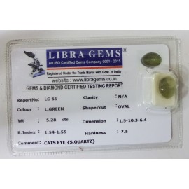 REPORT NO . LC 65CLARITY . N/ACOLOUR . L . GREENSHAPE / CUT . OVALWT . 5.28 CTSDIMENSION . 1-5.10-3.6-4.R . INDEX . 1.54-1.55HARDNESS . 7.5COMMENT . CATS EYE { S . QUARTZ }..