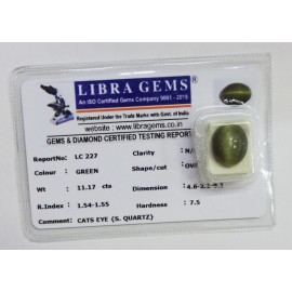 REPORT NO . LC 227CLARITY . N/ACOLOUR . GREENSHAPE / CUT . OVALWT . 11.17 CTSDIMENSION . 4-6.2-1.9-1.R . INDEX . 1.54-1.55HARDNESS . 7.5COMMENT . CATS EYE { S . QUARTZ }..