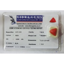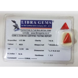 REPORT NO . LCI 86CLARITY . N/ACOLOUR . REDSHAPE / CUT . TRIANGLEWT . 3.34 CTSDIMENSION . 1-7.9-6.4-8.R . INDEX . N/AHARDNESS . 3.5COMMENT . CORAL..