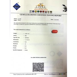 REPORT NO . LCI 229CLARITY . N/ACOLOUR . REDSHAPE / CUT . REDWT . 3.77 CTSDIMENSION . 4-5.5-8.5-3.R . INDEX . N/AHARDNESS . 3.5COMMENT . CORAL..