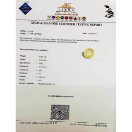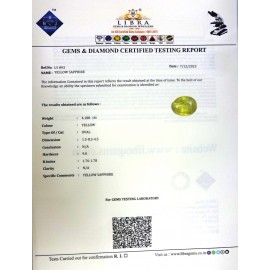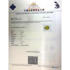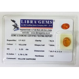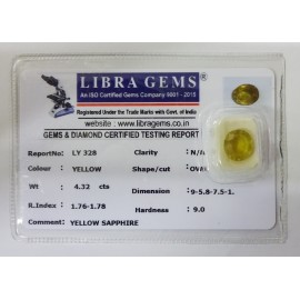 REPORT NO . LY 328CLARITY . N/ACOLOUR . YELLOWSHAPE / CUT . OVALWT . 4.32 CTSDIMENSION . 9-5.8-7.5-1.R . INDEX . 1.76-1.78HARDNESS . 9.0COMMENT . YELLOW SAPPHIRE..