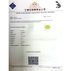 REPORT NO . LYA 19CLARITY . N/ACOLOUR . YELLOWSHAPE / CUT . OVALWT . 3.50 CTSDIMENSION . 9-7.7-4.5-3.R . INDEX . 1.76-1.78HARDNESS . 9.0COMMENT . YELLOW SAPPHIRE..