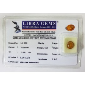 REPORT.NO.LY 370CLARITY.N/ACOLOUR.YELLOWSHAPE/CUT.OVALWT.3.68 CTSDIMENSION.8.8-7.4-5.4R.INDEX.1.76-1.78HARDNESS.9.0COMMENT.YELLOW SAPPHIRE..