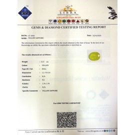 REPORT NO . LY 104CLARITY . N/ACOLOUR . YELLOWSHAPE / CUT . OVALWT . 4.37 CTSDIMENSION . 10-3.8-7.5-1.R . INDEX . 1.76-1.78HARDNESS . 9.0COMMENT . YELLOW SAPPHIRE..