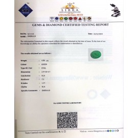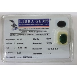 REPORT NO . LE 69CLARITY . N/ACOLOUR . GREENSHAPE / CUT . OVALWT . 4.02 CTSDIMENSION . 2-3.9-5.5-2.R . INDEX . 1.57HARDNESS . 7.5COMMENT . EMERALD..