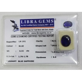 REPORT NO . LN 80CLARITY . N/ACOLOUR . BLUESHAPE / CUT . OVALWT . 4.26 CTSDIMENSION .1-4.7-8.4-3.R . INDEX . 1.76-1.78HARDNESS . 9.0COMMENT . BLUE SAPPHIRE..