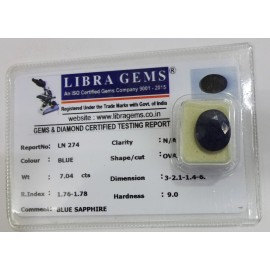 REPORT.NO.-LN 274CLARITY.-N/ACOLOUR.-BLUESHAPE/CUT.-OVALWT.-7.04 CTSDIMENSION.-3-2.1-1.4-6.R.INDEX.-1.76-1.78HARDNESS.-9.0COMMENT.-BLUE SAPPHIRE..