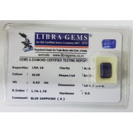 REPORT NO . LNA 18CLARITY . N/ACOLOUR . BLUESHAPE / CUT . RECTANGLEWT . 4.63 CTSDIMENSION . 10-9.7-6.4-9.R . INDEX . 1.76-1.78HARDNESS . 9.0COMMENT . BLUE SAPPHIRE { A }..