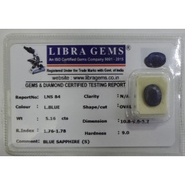 REPORT.NO.-LNS 84CLARITY.-N/ACOLOUR.-L. BLUESHAPE/CUT.-OVALWT.-5.16 CTSDIMENSION.-10-8.9-6.5-2.R.INDEX.-1.76-1.78HARDNESS.-9.0COMMENT.-BLUE SAPPHIRE { S }..