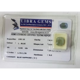 REPORT NO . LNS 10CLARITY . N/ACOLOUR . L . BLUESHAPE / CUT . OVALWT . 6.66 CTSDIMENSION . 10-2.9-3.6-5.R . INDEX . 1.76-1.78HARDNESS . 9.0COMMENT . BLUE SAPPHIRE { S }..