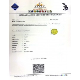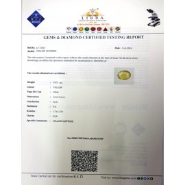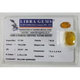 REPORT NO . LY 84CLARITY . N/ACOLOUR . YELLOWSHAPE / CUT . OVALWT . 10.97 CTSDIMENSION . 5-1.1-2.6-5.R . INDEX . 1.76-1.78HARDNESS . 9.0COMMENT . YELLOW SAPPHIRE..