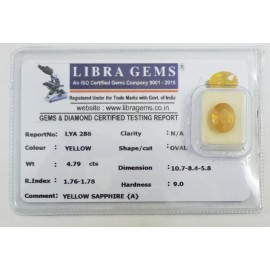 REPORT.NO.LYA 286CLARITY.N/ACOLOUR.YELLOW SHAPE/CUT.OVALWT.4.79 CTSDIMENSION.10.7-8.4-5.8R.INDEX.1.76-1.78HARDNESS.9.0COMMENT.YELLOW SAPPHIRE {A}..