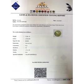 REPORT.NO.-LY 700CLARITY.-N/ACOLOUR.-YELLOWSHAPE/CUT.-OVALWT.-7.76 CTSDIMENSION.-3-3.10-6.5-1.R.INDEX.-1.76-1.78HARDNESS.-9.0COMMENT.-YELLOW SAPPHIRE..