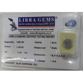 REPORT.NO.-LNS 90CLARITY.-N/ACOLOUR.-L. BLUESHAPE/CUT.-OVALWT.-3.24 CTSDIMENSION.-8-7.7-4.5-4.R.INDEX.-1.76-1.78HARDNESS.-9.0COMMENT.-BLUE SAPPHIRE { S }..