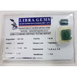 REPORT NO . LEJ 22CLARITY . N/ACOLOUR . GREENSHAPE / CUT . SQUAREWT . 7.14 CTSDIMENSION . 1-4.1-1.7-6.R . INDEX . 1.57HARDNESS . 7.5COMMENT . EMERALD ( J )..