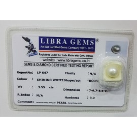 REPORT NO . LP 647CLARITY . N/ACOLOUR . SHINING WHITESHAPE / CUT . ROUNDWT . 3.55 CTSDIMENSION . 7-9.7-8.6-9.R . INDEX . N/AHARDNESS . 3.0COMMENT . PEARL..