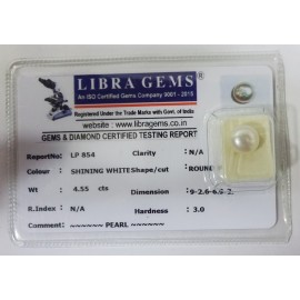 REPORT NO . LP 854CLARITY . N/ACOLOUR . SHINING WHITESHAPE / CUT . ROUNDWT . 4.55 CTSDIMENSION . 9-2.6-6.9-2.R . INDEX . N/AHARDNESS . 3.0COMMENT . PEARL..