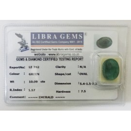 REPORT.NO.LE 762CLARITY.N/ACOLOUR.GREENSHAPE/CUT.OVALWT.10.09 CTSDIMENSION.5.4-1.5-7.2R.INDEX.1.57HARDNESS.7.5COMMENT.EMERALD ..