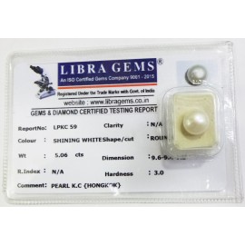 REPORT.NO.-LPKC 59CLARITY.-N/ACOLOUR.-SHINING WHITESHAPE/CUT.-ROUNDWT.-5.06 CTSDIMENSION.-9-6.9-4.7-8.R.INDEX.-N/AHARDNESS.-3.0COMMENT.-PEARL K.C { HONGKOK }..