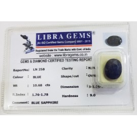 REPORT.NO.-LN 258CLARITY.-N/ACOLOUR.-BLUESHAPE/CUT.-OVALWT.-10.68 CTSDIMENSION.-3-1.10-7.7-5.R.INDEX.-1.76-1.78HARDNESS.-9.0COMMENT.-BLUE SAPPHIRE..