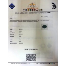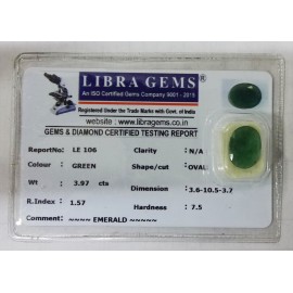 REPORT NO . LE 106CLARITY . N/ACOLOUR . GREENSHAPE / CUT . OVALWT . 3.97 CTSDIMENSION . 3-6.10-5.3-7.R . INDEX . 1.57HARDNESS . 7.5COMMENT . EMERALD..