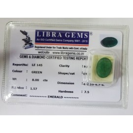 REPORT NO . LE 145CLARITY . N/ACOLOUR . GREENSHAPE / CUT . OVALWT . 8.00 CTSDIMENSION . 4-4.10-6.7-6.R . INDEX . 1.57HARDNESS . 7.5COMMENT . EMERALD..
