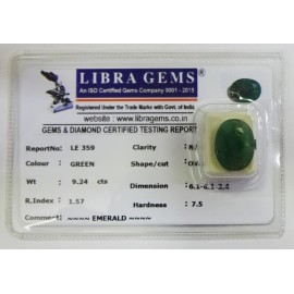 REPORT.NO.LE 359CLARITY.N/ACOLOUR.GREENSHAPE/CUT.OVALWT.9.24 CTSDIMENSION.6-1.6-1.2-4.R.INDEX.1.57HARDNESS.7.5COMMENT.EMERALD..