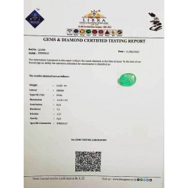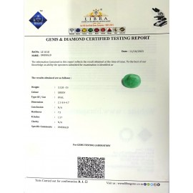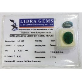 REPORT.NO.- LE 169CLARITY.- N/ACOLOUR.- GRRENSHAPE/CUT.- OVALWT.- 4.53 CTSDIMENSION.- 2-5.9-5.6-2.R.INDEX.- 1.57HARDNESS.- 7.5COMMENT.- EMERALD..