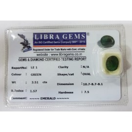 REPORT NO . LE 1CLARITY . N/ACOLOUR . GREENSHAPE / CUT . OVALWT . 3.51 CTSDIMENSION . 10-7.8-7.8-1.R . INDEX . 1.57HARDNESS . 7.5COMMENT . EMERALD..