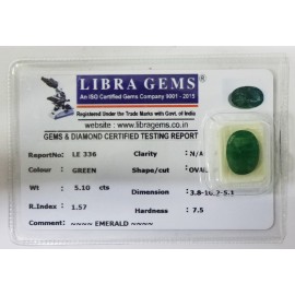 REPORT.NO.-LE 336CLARITY.-N/ACOLOUR.-GREENSHAPE/CUT.-OVALWT.-5.10 CTSDIMENSION.-3.8-10.2-5.1R.INDEX.-1.57HARDNESS.-7.5COMMENT.-EMERALD..