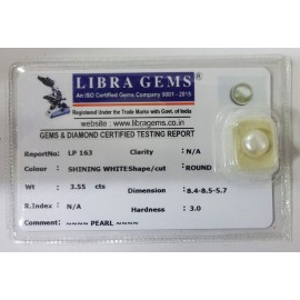 REPORT NO . LP 163CLARITY . N/ACOLOUR . SHINING WHITESHAPE / CUT . ROUNDWT . 3.55 CTSDIMENSION . 8-4.8-5.5-7.R . INDEX . N/AHARDNESS . 3.0COMMENT . PEARL..