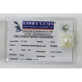 REPORT NO . LP 232CLARITY . N/ACOLOUR . SHINING WHITESHAPE / CUT . ROUNDWT . 9.02 CTSDIMENSION . 1-5.1-5.8-9.R . INDEX . N/AHARDNESS . 3.0COMMENT . PEARL..