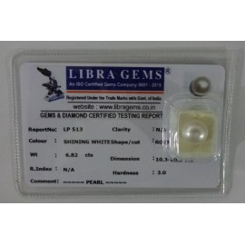 REPORT NO . LP 513CLARITY . N/ACOLOUR . SHINING WHITESHAPE / CUT . ROUNDWT . 6.82 CTSDIMENSION . 10-3.10-3.7-6.R . INDEX . N/AHARDNESS . 3.0COMMENT . PEARL..