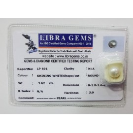 REPORT NO . LP 691CLARITY . N/ACOLOUR . SHINING WHITESHAPE / CUT . ROUNDWT . 3.62 CTSDIMENSION . 8-1.8-1.6-6.R . INDEX . N/AHARDNESS . 3.0COMMENT . PEARL..