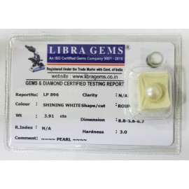 REPORT NO . LP 896CLARITY . N/ACOLOUR . SHINING WHITESHAPE / CUT . ROUNDWT . 3.91 CTSDIMENSION . 8-8.8-8.6-7.R . INDEX . N/AHARDNESS . 3.0COMMENT . PEARL..