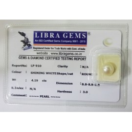 REPORT NO . LP 910CLARITY . N/ACOLOUR . SHINING WHITESHAPE / CUT . ROUNDWT . 4.19 CTSDIMENSION . 8-8.8-8.6-8.R . INDEX . N/AHARDNESS . 3.0COMMENT . PEARL..