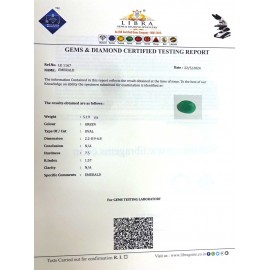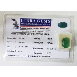 REPORT NO . LEJ 50CLARITY . N/ACOLOUR . GREENSHAPE / CUT . OVALWT . 4.36 CTSDIMENSION . 2-5.8-9.5-7.R . INDEX . 1.57HARDNESS . 7.5COMMENT . EMERALD { J }..