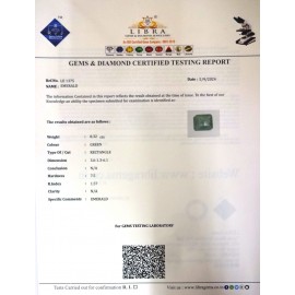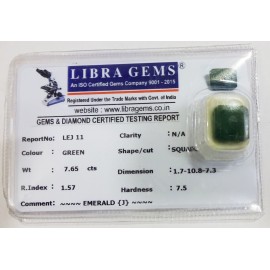 REPORT NO . LEJ 11CLARITY . N/ACOLOUR . GREENSHAPE / CUT . SQUAREWT . 7.65 CTSDIMENSION . 1-7.10-8.7-3.R . INDEX . 1.57HARDNESS . 7.5COMMENT . EMERALD ( J )..