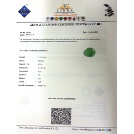 DATE:10-10-2023REF.NO:LE 989NAME:EMERALDWEIGHT:3.71 CTSCOLOUR:GREENTYPE OF/CUT:OVALDIMENSION:1-4.8-7.6-1.CONCLUSION:N/AHARDNESS:7.5R.INDEX:1.57CLARITY:N/ASPECIFIC COMMENTS:EMERALD..