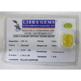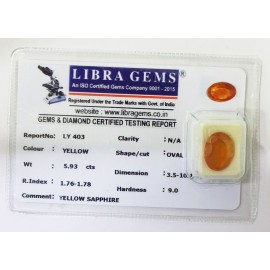 REPORT NO . LYA 15CLARITY . N/ACOLOUR . YELLOWSHAPE / CUT . OVALWT . 5.71 CTSDIMENSION . 2-5.9-4.5-1.R . INDEX . 1.76-1.78HARDNESS . 9.0COMMENT . YELLOW SAPPHIRE..