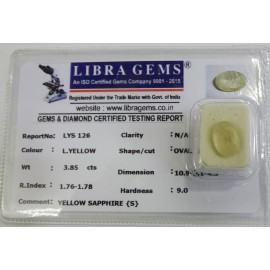 REPORT.NO.-LYS 126CLARITY.-N/ACOLOUR.-L. YELLOWSHAPE/CUT.-OVALWT.-3.85 CTSDIMENSION.-10-9.8-1.4-5.R.INDEX.-1.76-1.78HARDNESS.-9.0COMMENT.-YELLOW SAPPHIRE [ S }..