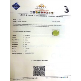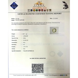 REPORT NO . LY 266CLARITY . N/ACOLOUR . YELLOWSHAPE / CUT . OVALWT . 5.2 CTSDIMENSION . 2-2.9-2.4-3.R . INDEX . 1.76-1.78HARDNESS . 9.0COMMENT . YELLOW SAPPHIRE..