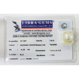 REPORT NO . LP 287CLARITY . N/ACOLOUR . SHINING WHITESHAPE / CUT . ROUNDWT . 8.28 CTSDIMENSION . 1-5.1-5.7-9.R . INDEX . N/AHARDNESS . 3.0COMMENT . PEARL..